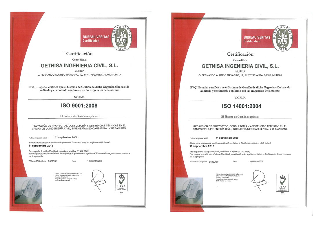 INGENIERÍA CIVIL IGENIA-GETNISA disponen de los Certificados de Registro Bureau-Veritas que garantizan que los sistemas de calidad y gestión medioambiental implantados en la firma son conformes con la exigencia de las normas de: